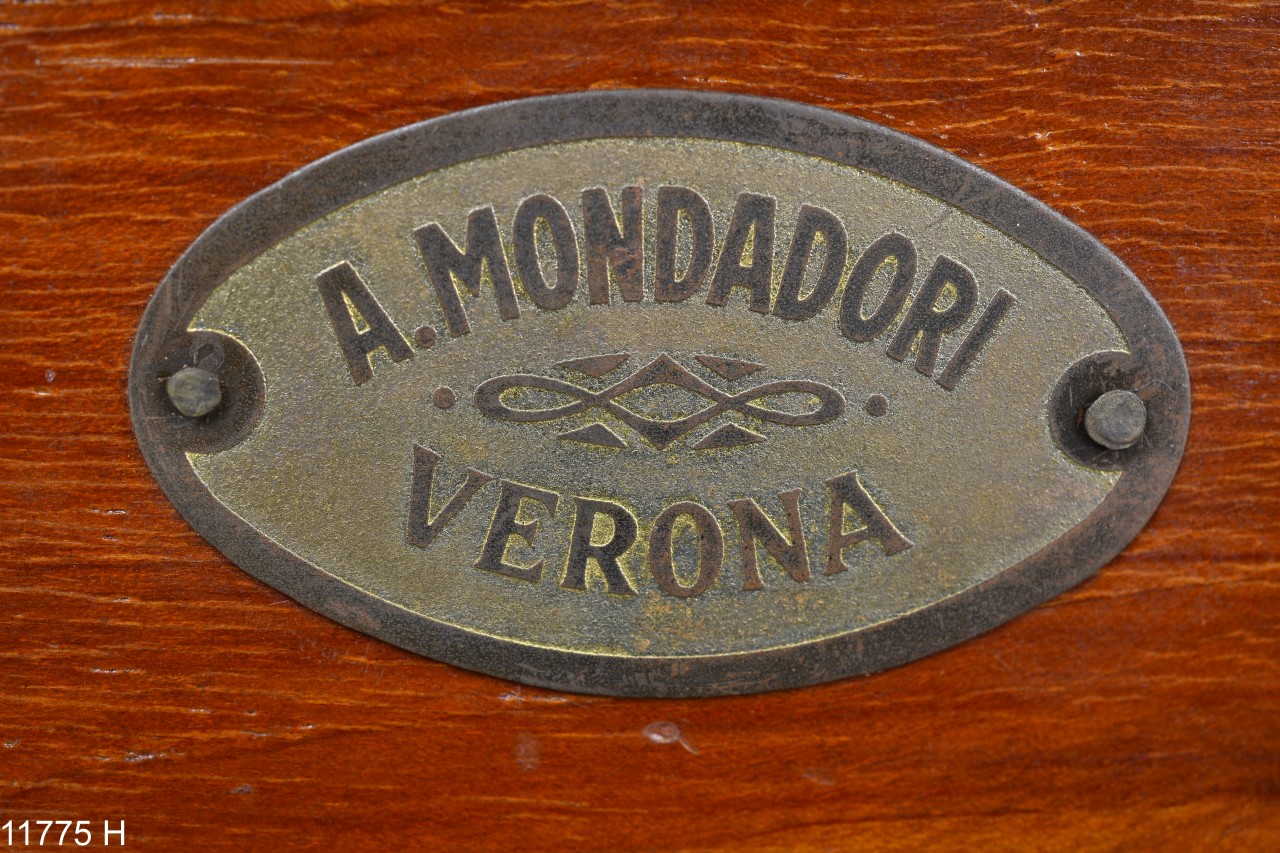 - ISCRIZIONI sulla faccia laterale della base di legno - A. Mondadori - ditta costruttrice A. Mondadori - maiuscolo - a rilievo - italiano