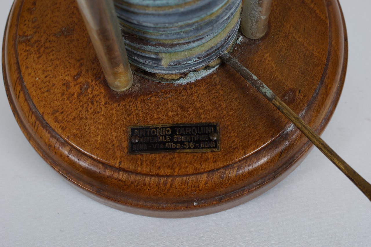 - ISCRIZIONI targhetta in metallo sulla faccia superiore della base in legno - ANTONIO TARQUINI MATERIALE SCIENTIFICO ROMA - Via Alba, 36 - Roma - ditta costruttrice Antonio Tarquini - maiuscolo - a rilievo - italiano