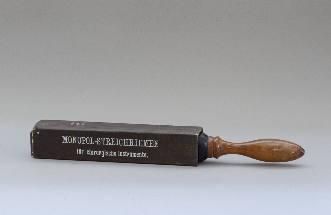 Affila lame a quattro facciate realizzato con struttura in legno e coramella in grafite e cuoio e con custodia in cartone rigido di colore marrone