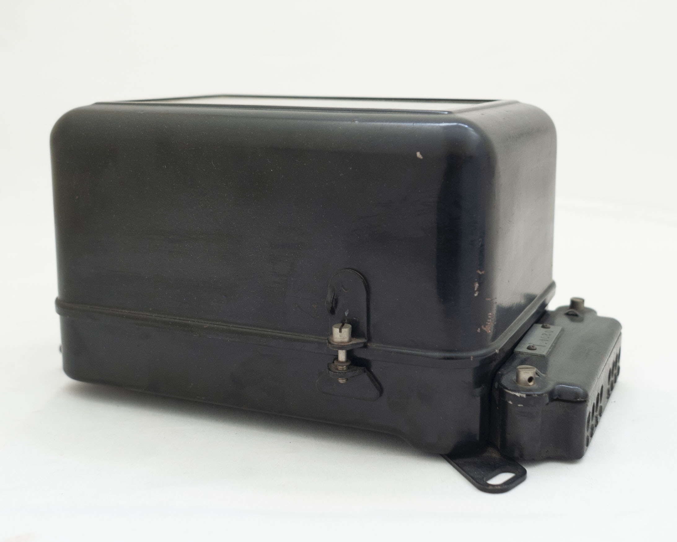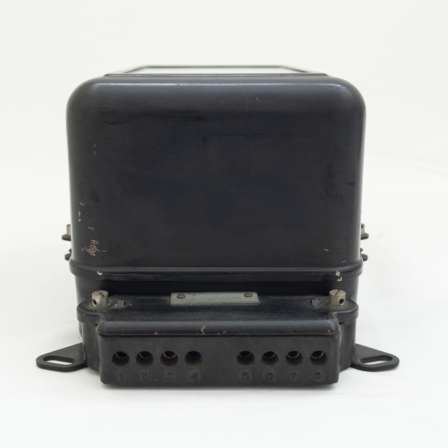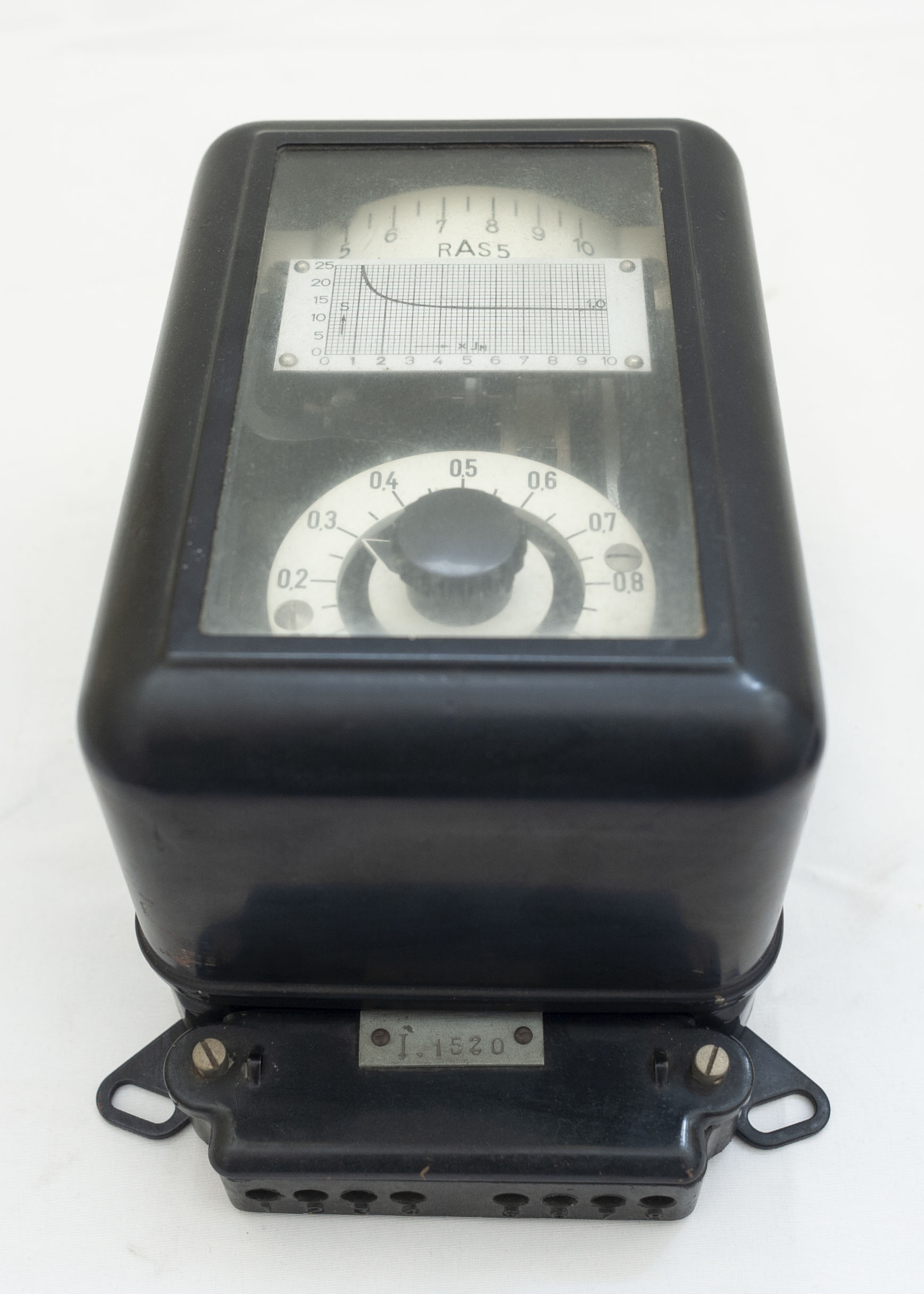 E’ un relais di massima corrente, RAS 5, a tempo dipendente. E’ racchiuso in un involucro metallico e attraverso la superficie in vetro sono visibili: una striscia metallica sulla quale sono stampati una scala, graduata da 5 a 10, i dati tecnici e il logo del costruttore; una targa metallica sulla quale è stampata la caratteristica di intervento tempo-corrente; una manopola con indice che scorre su una scala circolare, graduata da 0,1 a 1 x S, che ha la funzione di traslare la caratteristica di intervento. La morsettiera, avvitata sul fronte dello strumento, in basso, è protetta da un coperchio metallico al cui interno è incollato un foglietto con stampato lo schema elettrico di collegamento con il circuito esterno