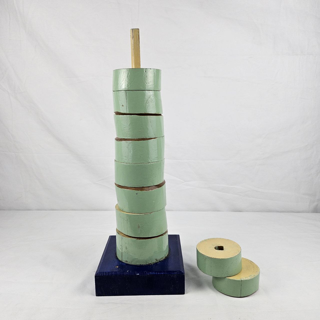 il modello didattico del fusto si compone di 10 elementi di forma circolare di diversa dimensione, che si poggiano uno sull’altro inserendosi in un sostegno centrale. Il modello, dipinto in verde chiaro e giallo, ha una base di forma quadrata e di colore blu