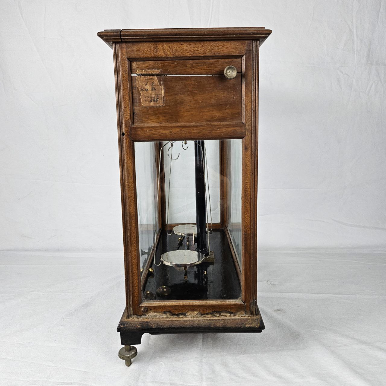 la bilancia si presenta in una teca in vetro apribile, che la protegge dalla polvere e dalle correnti d’aria, evitando così interferenze nella misurazione. E' costituita da un giogo oscillante attorno a un fulcro, con due piatti alle estremità. L’intero strumento è sostenuto da tre piedini in metallo, due anteriori e uno posteriore, che garantiscono stabilità durante l’uso