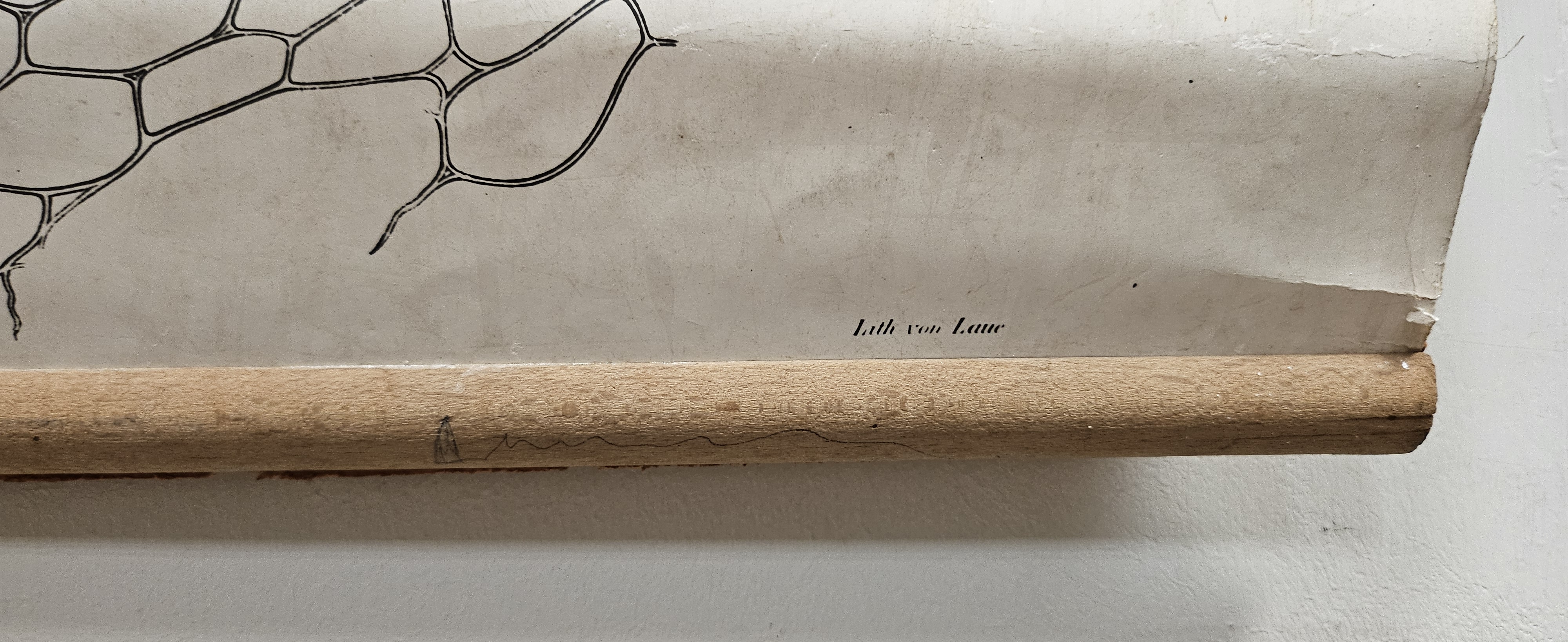 la carta murale, copia a stampa di un'altra tavola, è ancorata, alle estremità superiore e inferiore, a due bacchette di legno. La tavola ha un'unica figura, senza legenda, e illustra la sezione trasversale del cilindro centrale della radice di Vicia Faba L., con formazione avanzata di legno secondario. La Vicia Faba, comunemente conosciuta come fava, è una pianta della famiglia delle Leguminose o Fabaceae. La carta murale è una probabile copia del disegno originale