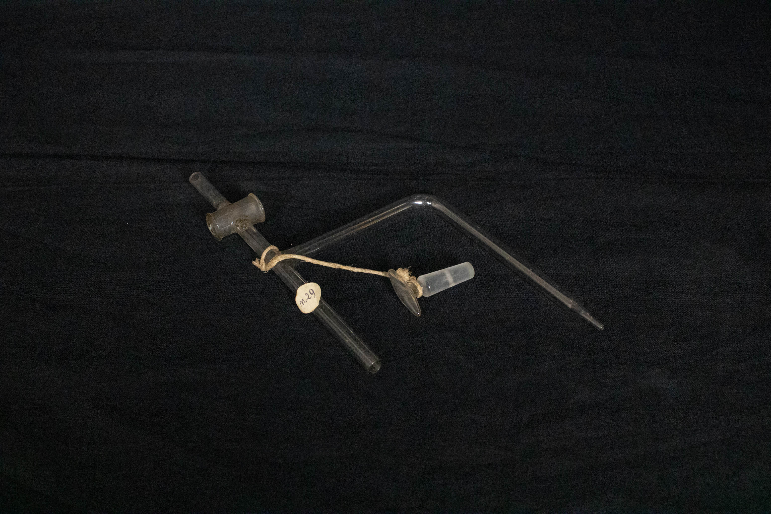 lo strumento è un tubo orizzontale con un’estensione a gomito angolata verso l’alto, terminante con un'estremità appuntita. E' presente anche un tappo in vetro legato con un cordino alla struttura principale. molto probabilmente si tratta di una parte componente un distillatore di oli essenziali dalle piante