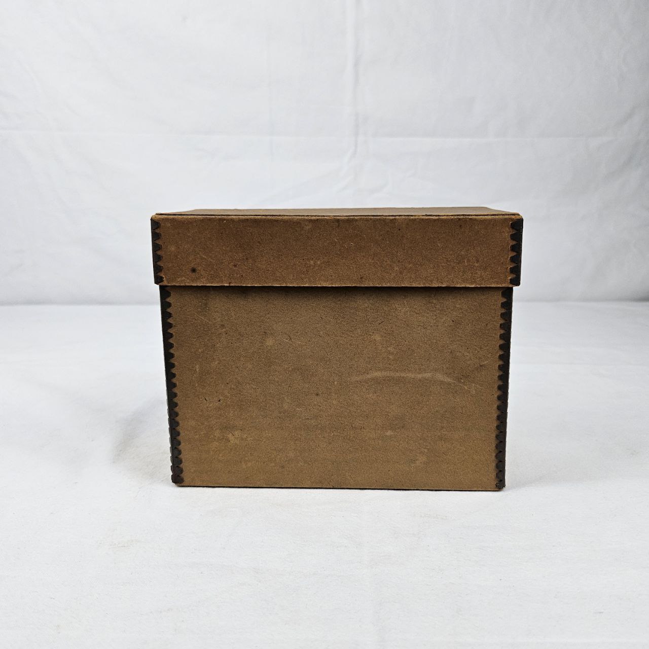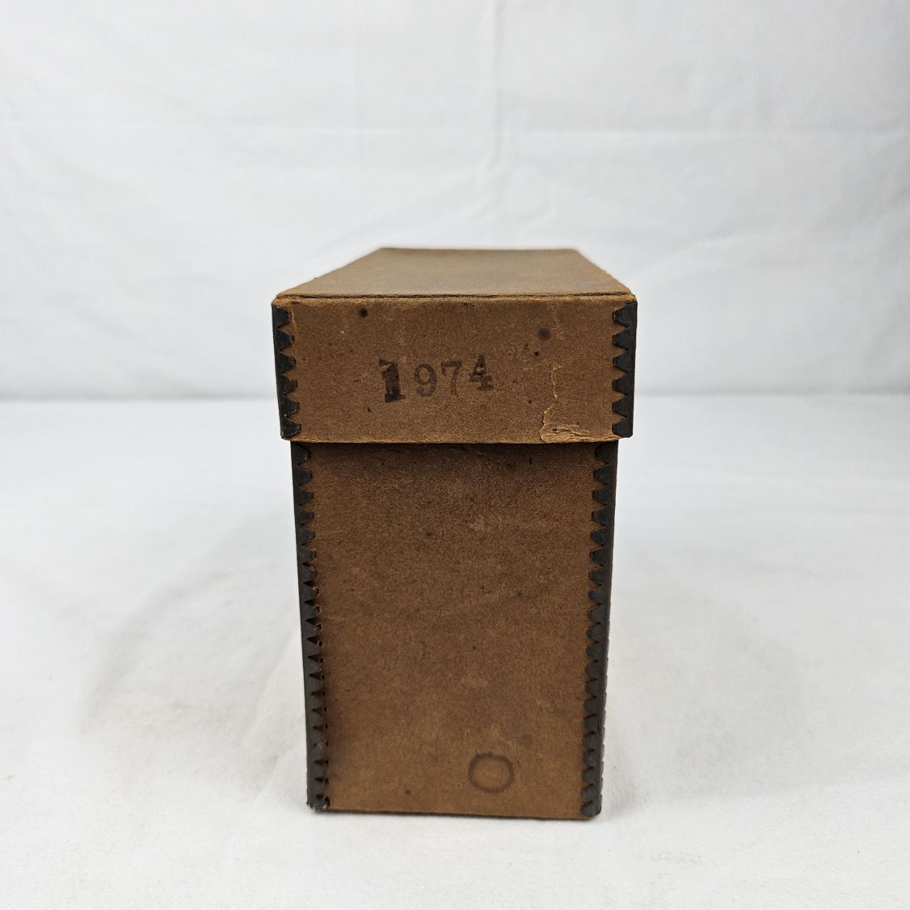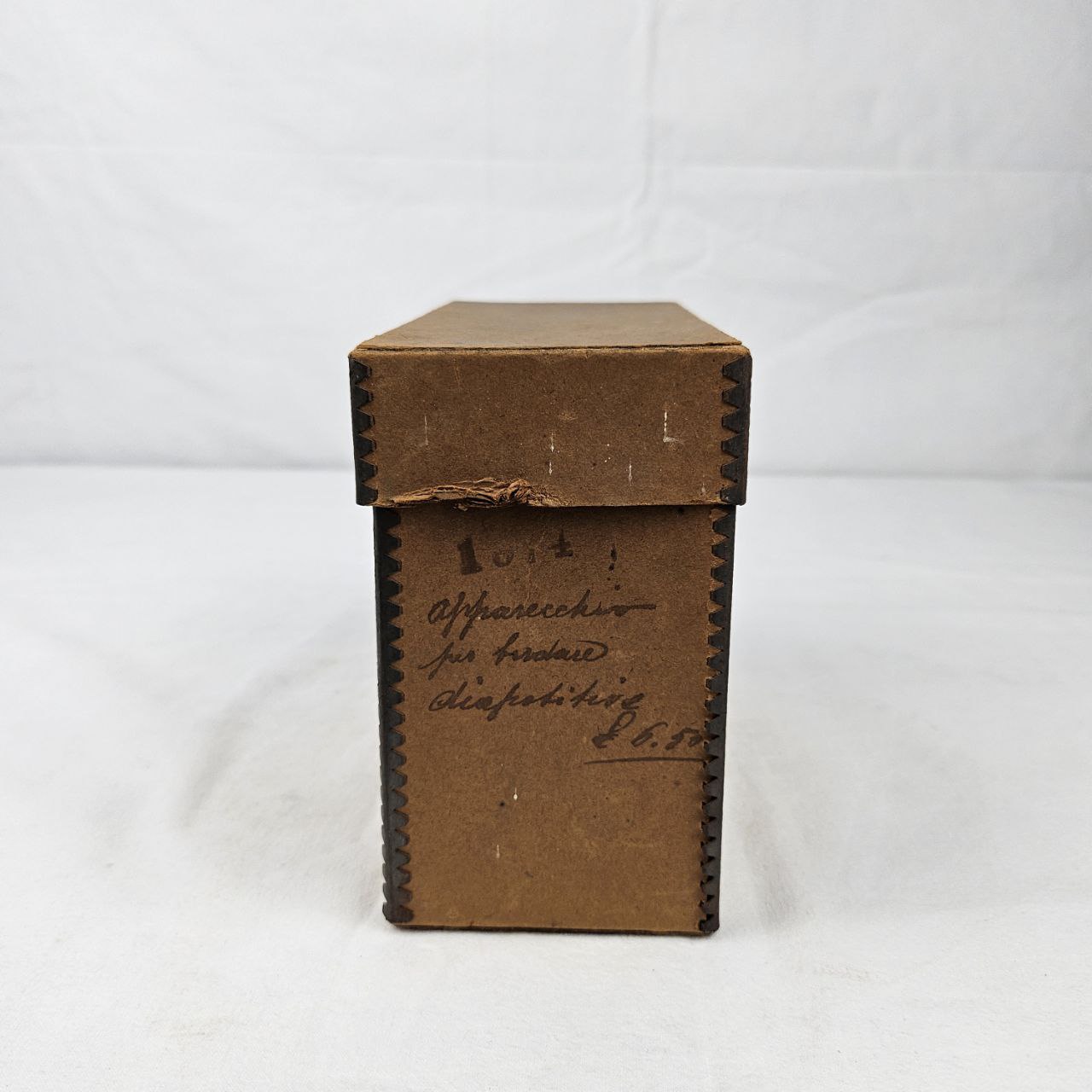 il contenitore, di forma rettangolare e privo del contenuto originario, presenta una bordatura in metallo su tutti e quattro gli angoli. In base all’iscrizione, custodiva uno strumento per la bordatura di diapositive, attualmente mancante