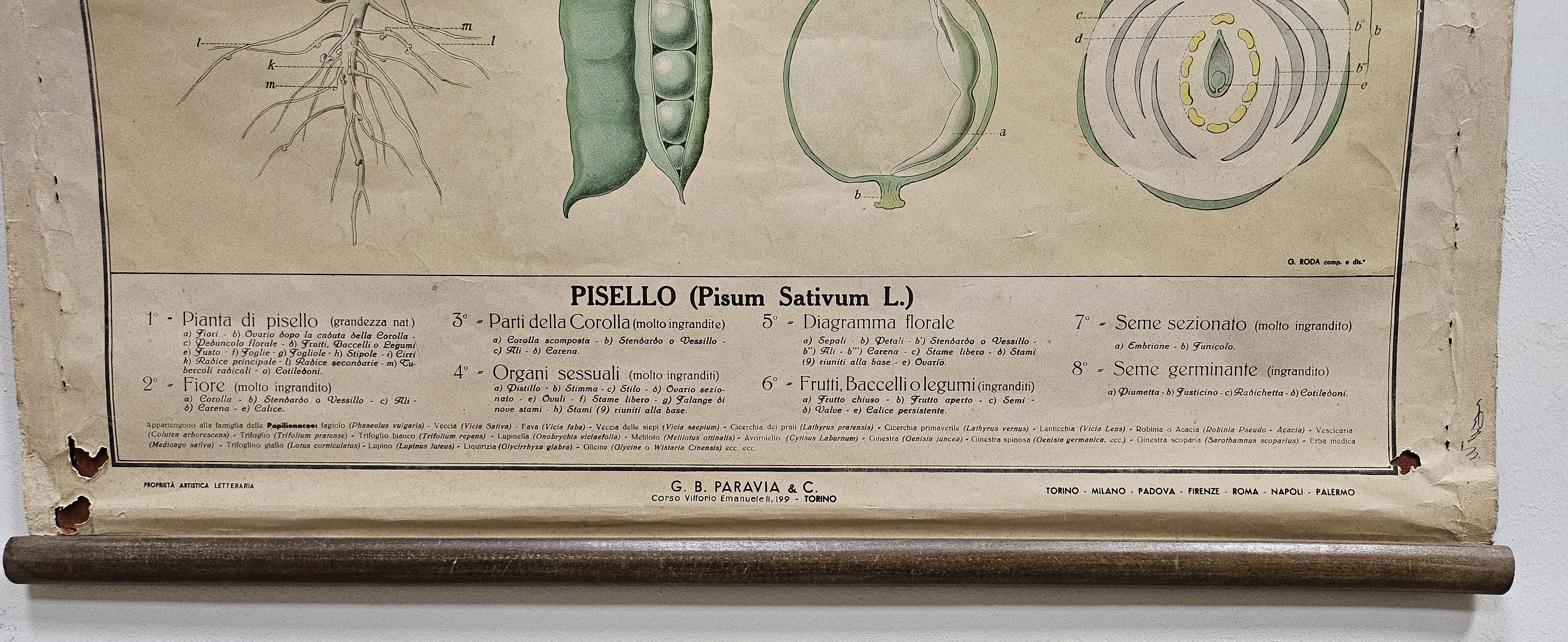 La carta murale è realizzata su cartoncino foderato di carta lucida di colore ruggine, ed è ancorata alle estremità superiore ed inferiore a due bacchette di legno. La tavola ha 8 figure con leggenda posta sul fronte, nel margine inferiore, e illustra sia l’intera pianta del del Pisello (Pisum sativum L.), sia i dettagli morfologici e riproduttivi caratteristici delle Papilionaceae (oggi Fabaceae)