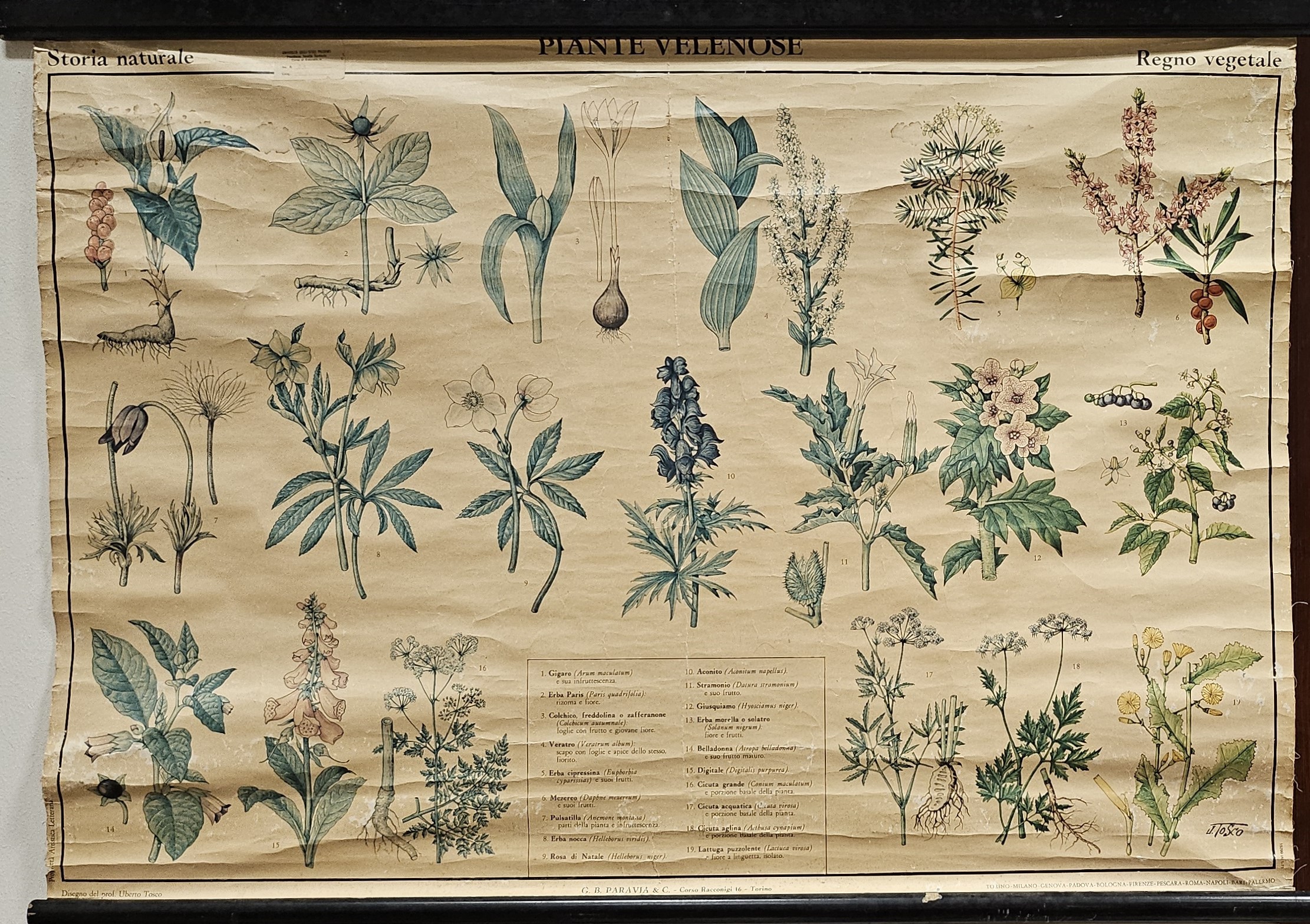 la carta murale è realizzata su cartoncino telato ed è ancorata, alle estremità superiore ed inferiore, a due bacchette di legno. La tavola ha 19 figure, con legenda, e illustra le seguenti piante velenose: Gigaro (Arum maculatum); Erba Paris (Paris quadrifolia); Colchico, freddolina o zafferanone (Colchicum autumnale); Veratro (Veratrum album); Erba cipressina (Euphorbia cyparissias); Mezzero (Daphne mezereum); Pulsatilla (Pulsatilla montana); Erba nocca (Helleborus viridis); Rosa di Natale (Helleborus niger); Aconito (Aconitum napellus); Stramonio (Datura stramonium); Giusquiamo (Hyoscyamus niger); Erba morella o solatro (Solanum nigrum); Belladonna (Atropa belladonna); Digitale (Digitalis purpurea); Cicuta grande (Conium maculatum); Cicuta acquatica (Cicuta virosa); Cicuta aglina (Aethusa cynapium); Lattuga puzzolente (Lactuca virosa)