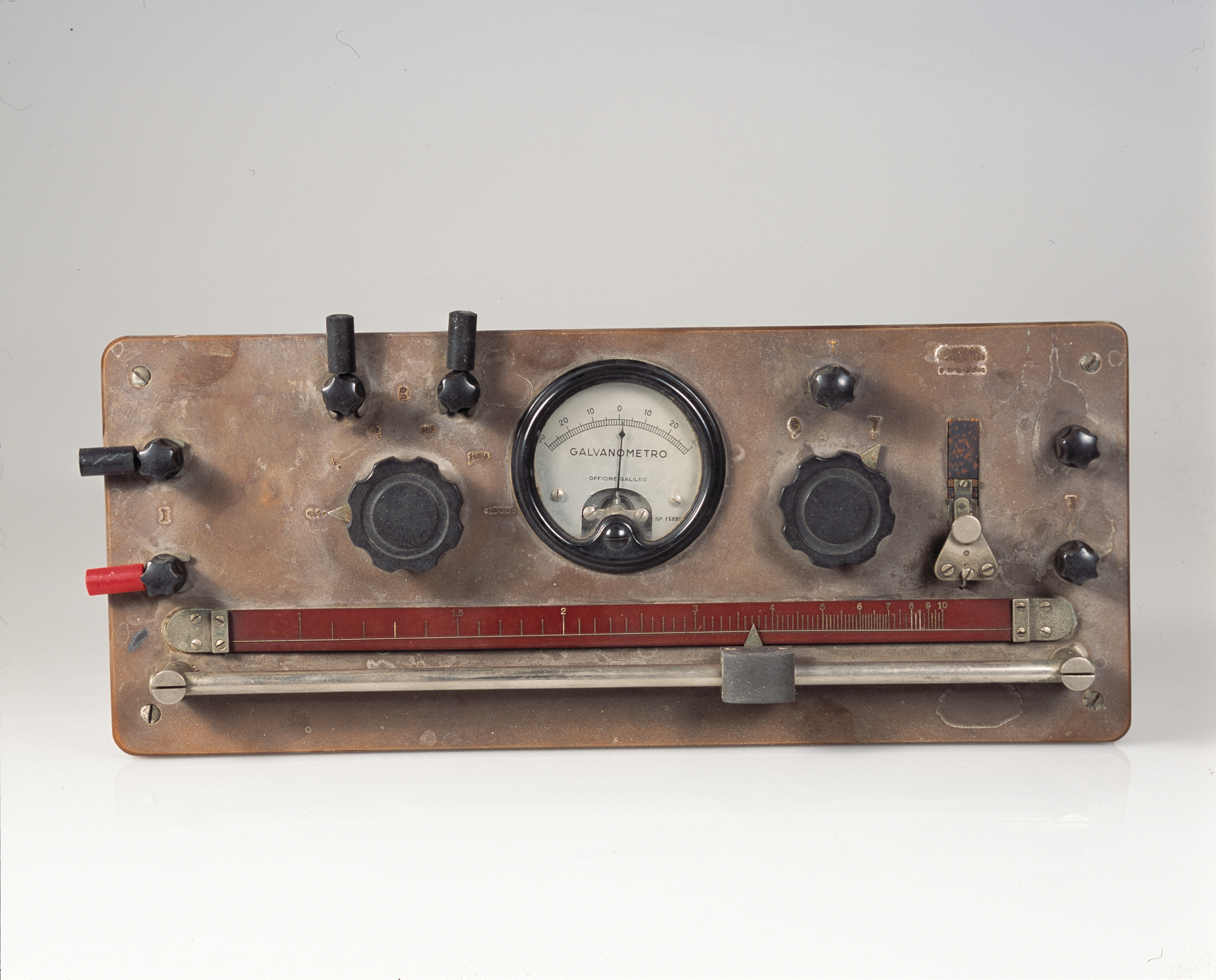 Lo strumento, essendo un ponte di Wheatstone a filo, presenta un filo calibrato teso sopra una scala millimetrica, un galvanometro (con finestra di lettura al centro), morsetti per le resistenze, manopole e una cuffia a bassa impedenza