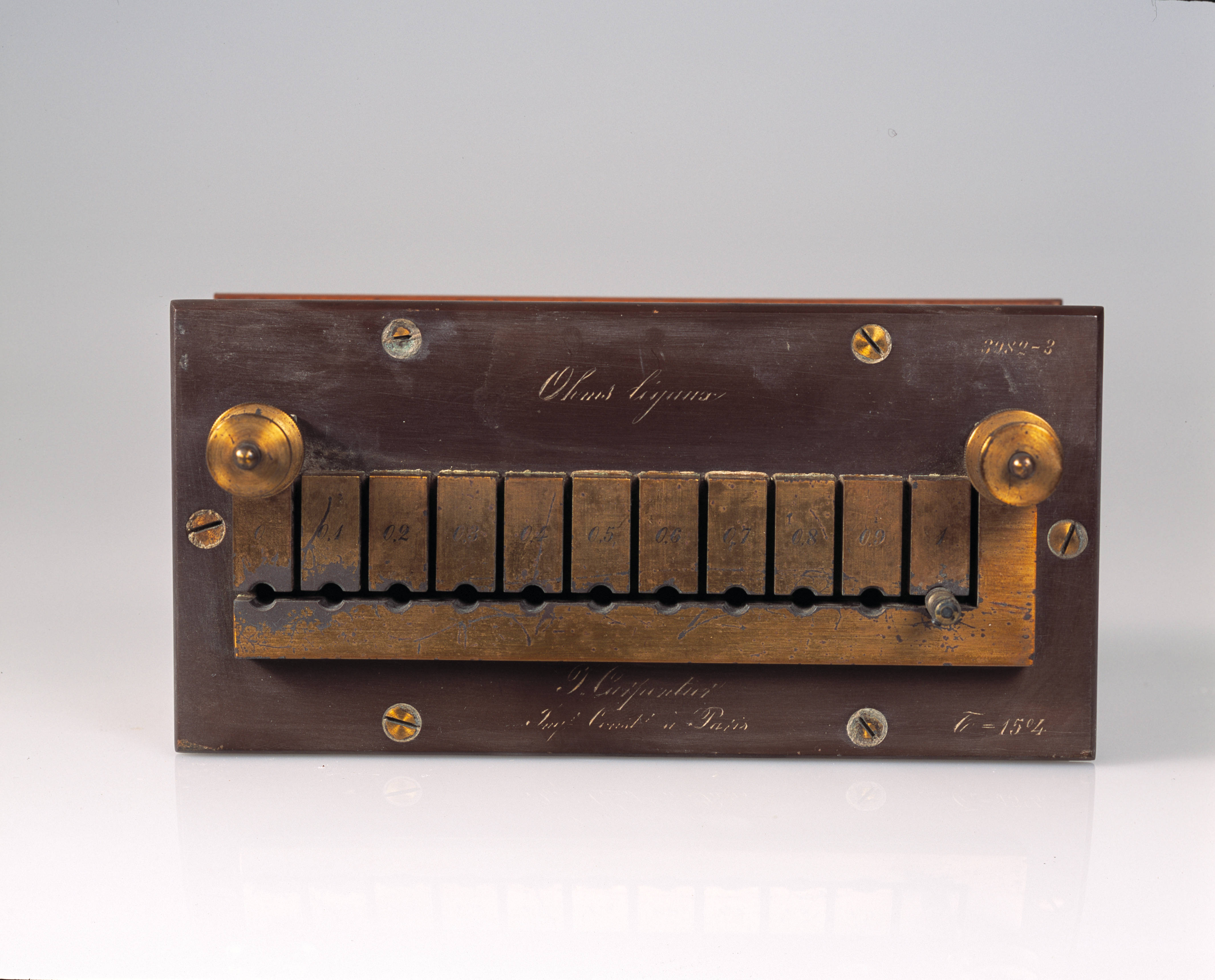 Dispositivo costituito da 10 resistenze, realizzate avvolgendo un conduttore metallico, con alta resistenza specifica, attorno ad un rocchetto e bloccandone i capi a dei morsetti, che permette un utilizzo più semplice quando è necessario operare con un certo multiplo di resistenze. I capi dei morsetti sono attaccati a due piastre di ottone ciascuna delle quali, ad eccezione della prima e dell'ultima, congiunge fra loro due rocchetti successivi. Tutte le piastre sono fissate sul coperchio di ebanite della cassetta; nell'intervallo tra due piastre attigue, dove si trova indicato il valore della resistenza sottostante, è possibile inserire una spinetta d'ottone che ne costituisce il contatto. Quando la cassetta è introdotta in un circuito elettrico, attraverso il primo e l'ultimo morsetto, se sono inserite tutte le spinette, la corrente incontra una resistenza minore, mentre estraendone alcune si osserva un graduale aumento della resistenza del circuito
