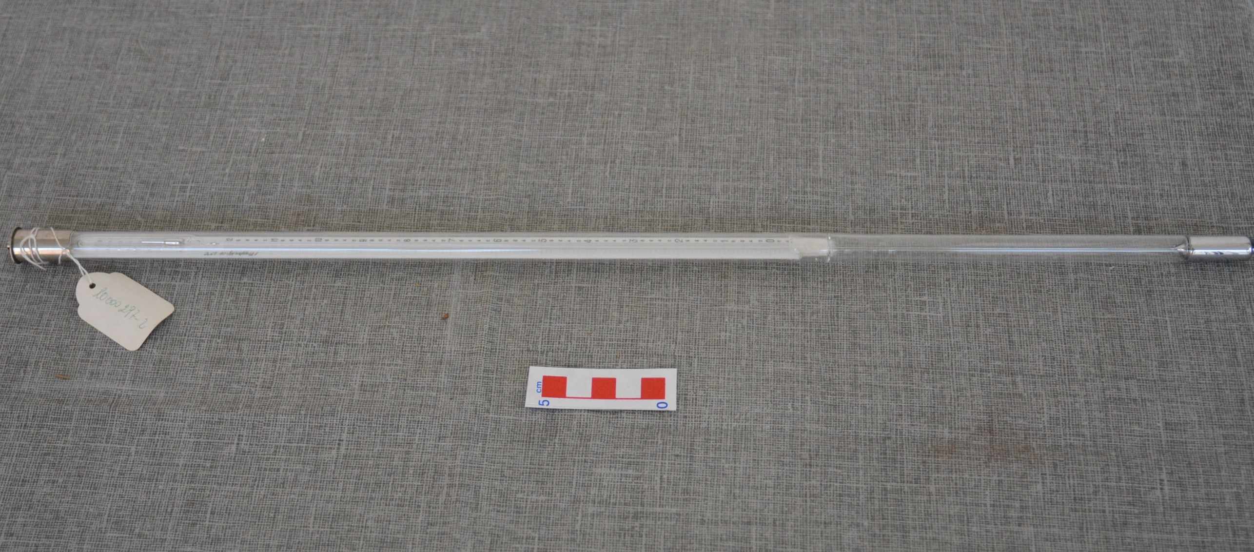 Termometro differenziale di Beckmann con scala interna incisa su lastra di vetro latteo, bulbo cilindrico, chiusura e testa in metallo. I termometri sono strumenti che consentono di determinare la misura della temperatura, sfruttando il principio della variazione di volume al variare della temperatura. Sono costituiti da un tubo capillare saldato a un bulbo di forma sferica o allungata, a pareti sottili e di capacità proporzionata alla sezione del capillare. Il sistema così costituito è appoggiato a una scala graduata e il tutto viene racchiuso all'interno di un tubo di vetro. La sensibilità di questi strumenti dipende dalla capacità del bulbo rispetto alla sezione del capillare. In tal caso il cannello è fornito di una piccola rigonfiata che ha la funzione di far giungere il mercurio nella parte del cannello connessa alla scala solo quando raggiunge la temperatura con la quale la graduazione inizia o termina. Di particolare precisione sono i termometri del tipo Beckmann, come i tre di questa serie: essi sono dotati di un bulbo piuttosto ampio mentre il cannello, protetto da un tubo di vetro che contiene anche la scala graduata, è piegato verso il basso all'estremità superiore e termina con un piccolo serbatoio. La scala nominale interna incisa in Celsius (Centigrade), è graduata da 0 a 12, con 10 suddivisioni interne per grado. Nella parte superiore presenta l’espansione graduata da -20 a 100 C, utile a spostare l’intervallo della scala principale nell’intervallo di misura di interesse