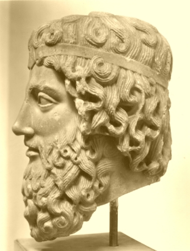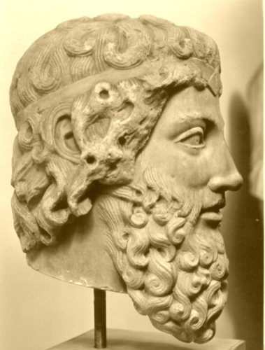 Testa maschile, circoscritta da un cercine, è caratterizzata dalla capigliatura che scende a ciocche spiraliformi ai lati del capo, dalla lunga barba a ciuffi ondulati con punte ricurve, dai baffi spessi e spioventi.
