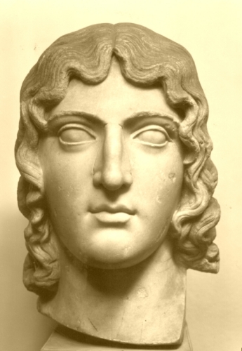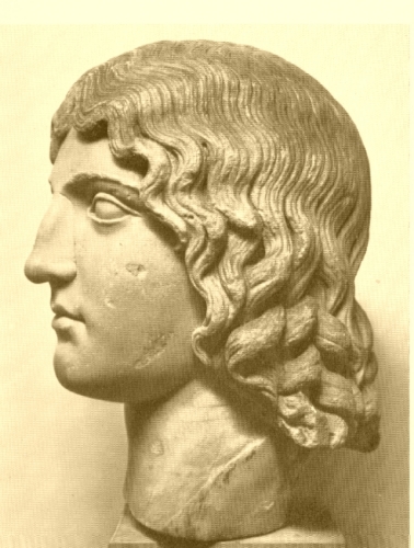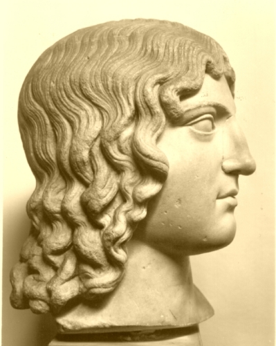 La testa femminile ha lineamenti precisi ma morbidi; i capelli, dalle ciocche sinuose, scendono sulla fronte e in soffici boccoli lungo le guance e sul collo.