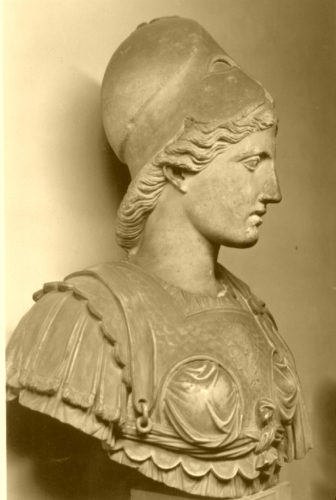 La testa dall'ovale morbido, possiede una fronte ampia di forma triangolare. Al di sotto di essa, le arcate soppraccigliari sono rese con spigoli vivi ed ombreggiano grandi occhi intenti alla riflessione. L'espressione è accentuata anche dalla bocca, dalle labbra carnose semi aperte. I capelli separati sulla fronte e raccolti sulla nuca sono coperti in gran parte dall'elmo corinzio.