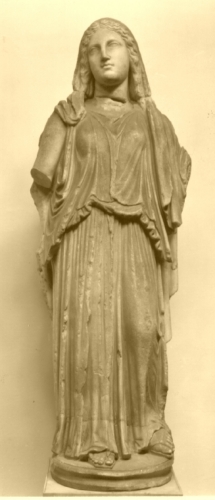 La figura femminile è stante, con peplo e mantello caratterizzati dalle fitte e mosse increspature del panneggio. La testa è inclinata e coperta da un lembo estremo del peplos; i capelli sono resi a ciocche ben segnate e ondulate. Mancano i due avambracci. Il retro è lavorato sommariamente.