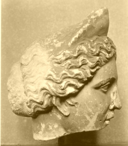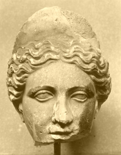 La testa, dall'ovale pieno e lievemente inclinato verso sinistra, ritrae una donna dalla fronte di forma triangolare pienamente investita dalla luce. Le arcate soppracigliari sono rese a spigolo vivo ed conferiscono severità e serietà al volto, ombreggiando i grandi occhi dalla forma a mandorla. Il naso, opera di restauro come pure le labbra socchiuse, è diritto e molto deteriorato. L'acconciatura si dispone in due bande laterali ondulate separate da una scriminatura centrale sulla fronte. Esse sono trattenute da un diadema liscio. I riccioli poi si raccolgono sul retro della figura in uno chignon, alcuni di essi però sfuggono al controllo e si dipongono sulle guance accanto alle orecchie.
