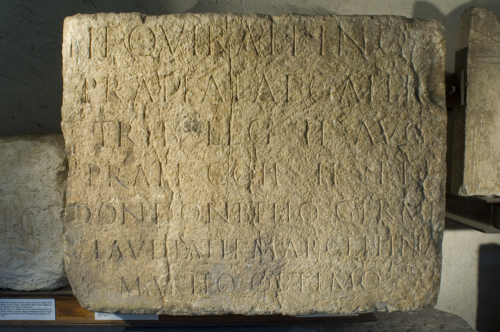 - ISCRIZIONI fronte - [Ti(berio) Claudio] / Ti(berii) f(ilio) Quir(ina) Alpino / praef(ecto) alae Gallic(ae), / trib(uno) leg(ionis) II Aug(ustae), / praef(ecto) coh(ortis) II pr(aetoriae), / don(is) don(ato) bello Germanico. / Claudia Ti(berii) f(ilia) Marcellina / marito optimo. - Lettere posate maiuscole - Incisione - latino