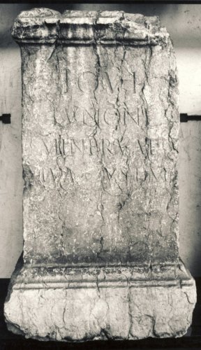 - NOTIZIE STORICO CRITICHE La collocazione cronologica del reperto si basa sul modulo dell'iscrizione decisamente quadrato. L'iscrizione è dedicata alla Triade Capitolina, fomata da Giove, Giunone e Minerva.