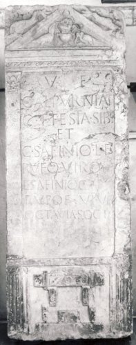 - ISCRIZIONI fronte - V(iva) f(ecit)/ Calpurnia / C(ai) f(ilia) Festa sibi / et / C(aio) Safinio L(uci) f(ilio) / Rufo viro, / L(ucio) Safinio C(ai) f(ilio) / Rufo f(ilio) VI vir(o), / Octavia socr(us). - Lettere posate maiuscole - Incisione - latino