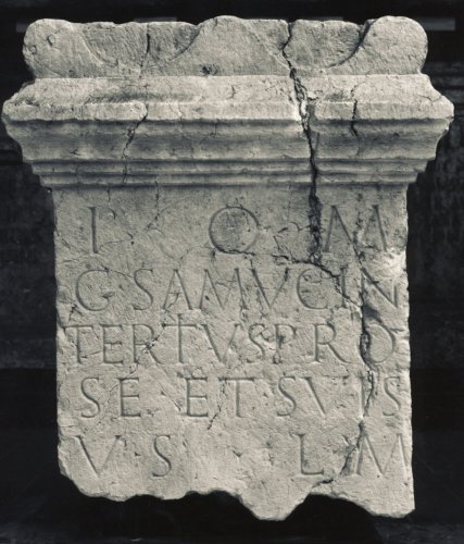 - ISCRIZIONI fronte - I(ovi) O(ptimo) M(aximo) / G(aius) (!) Samucin(us) / Tertius pro / se et suis / v(otum) s(olvit) l(ibens) m(erito). - Lettere posate maiuscole - Incisione - latino