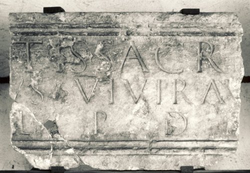 - ISCRIZIONI fronte - [--- Augus]tis sacr(um) / [--- Prob]us VIvir Au[g(ustalis)] / [v(otum) s(olvit) l(ibens) m(erito).] L(ocus) p(ublice) d(atus) d(ecreto) [d(ecurionum)]. - Lettere posate maiuscole - Incisione - latino