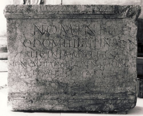 - ISCRIZIONI fronte e retro - Nomine / Q(uinti) Domitii Alpini / Licinia mater / signum Dianae et venationem / et salientes t(estamento) f(ieri) i(ussit). - Lettere posate maiuscole - Incisione - latino