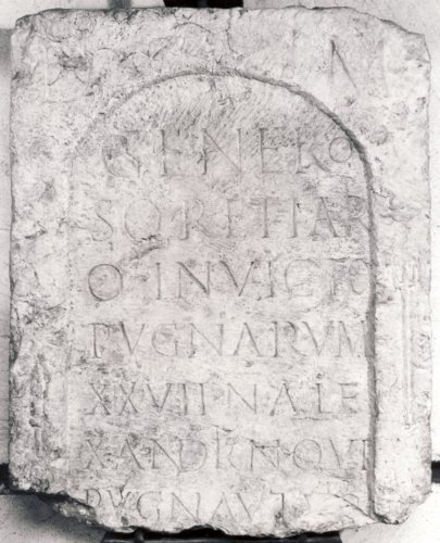 - ISCRIZIONI fronte - D(is) M(anibus). // Genero/ so retiari/ o invicto / pugnarum / XXVII, n(atione) Ale/ xandrin(o), qui / pugnavit vir/ [tute? ---] / ------. - Lettere posate maiuscole - Incisione - latino