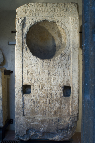 - ISCRIZIONI fronte - [S]ex(to) Salanio Sex(ti) f(ilio) Pob(lilia) / Mandato Viriano / IIIIIIvir(o).// V(ivus) f(ecit) / S[ex(tus)?---] f(ilius) / [------] / [------] / [------] / Paco[niai] Sex(ti) f(iliae) / Paullai uxori, / Sex(to) Virio Sex(ti) f(ilio) / Mercatori, / [Vi]riai Sex(ti) [f(iliae)] / Berullai, / Placido / conservatori / p(atrimonii) n(ostri). - Lettere posate maiuscole - Incisione - latino