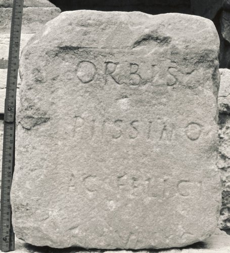 - ISCRIZIONI fronte - Orbis t[errarum ---] / piissimo [---] / ac felici[ssimo---] / Fl(avio) Val(erio) Co[stantino ---] / ------. - Lettere posate maiuscole - Incisione - latino