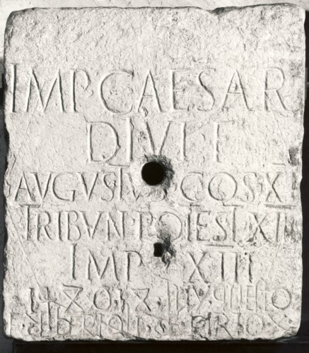 • NOTIZIE STORICO CRITICHE La collocazione cronologia dell'iscrizione è data dalla menzione della tredicesiam potestà tirbunizia di Augusto. Nella parte inferiore del fronte, al di sotto dell'iscrizione latina, compare la scritta "1480 18 luy questo / e de Bertoli de Pirto X" che si caratterizza per D e B tracciate in onciale e 8 "a clessidra". Si tratta di un'iscrizione forse riferibile ad un collezionista proprietario dell'iscrizione.