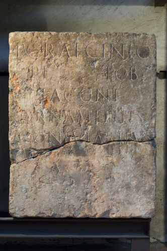 - ISCRIZIONI fronte - P(ublio) Graecinio / P(ubli) f(ilio) Pob(lilia) / Laconi / ornamentis / con[s]ularibus. - Lettere posate maiuscole - Incisione - latino