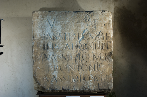 - ISCRIZIONI fronte - V(ivus) f(ecit) / L(ucius) Vassidius M(arci) f(ilius) / Mercator sibi et / M(arco) Vassidio M(arci) f(ilio) / Frontoni, / C(aio) Vassidio M(arci) f(ilio) / Clementi, / ------. - Lettere posate maiuscole - Incisione - latino