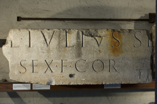 - ISCRIZIONI fronte - L(ucius) Iulius Se[x(ti)?---] / Sex(ti) f(ilius) Cor(nelia?)[---] / tr[---]. - Lettere posate maiuscole - Incisione - latino