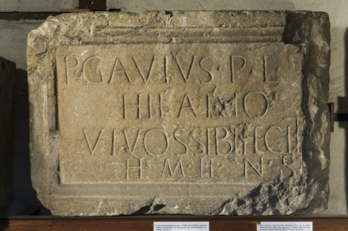 - ISCRIZIONI fronte - P(ublius) Gavius P(ubli) l(ibertus) / Hilario / vivos (!) sibi fecit. / H(oc) m(onumentum) h(eredem) n(on) s(equetur). - Lettere posate maiuscole - Incisione - latino