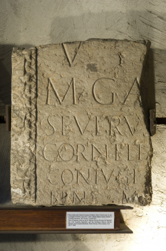 - NOTIZIE STORICO CRITICHE Si conosce il testo completo iscritto sulla stele a cui apparteneva il frammento in questione sulla base della tradizione manoscritta. A questo proposito CIL V, 3628 riporta: "V(ivus) [f(ecit)] / M(arcus) Ga[vius] / Severus [sibi et] / Cornelia[e Epimeliae] / coniugi [optimae] / bene m[erenti et] / M(arco) Gavio [Sereno et] / Corneliae Restitutae / libertis.". Si noti che al tempo di Mommsen era visibile anche il frammento angolare inferiore sinistro. L'iscrizione si data alla II metà del I secolo d.C. sulla base di criteri paleografici e per il formulario adottato (coniugi optimae benemerenti).