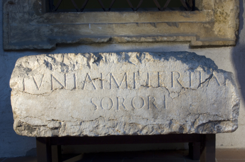- ISCRIZIONI fronte - Iuniai M(arci) f(iliai) Tertiai / sorori. - Lettere posate maiuscole - Incisione - latino