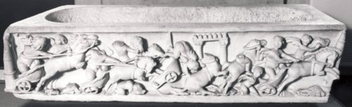 Sulla fronte è rappresentata una corsa di Eroti su carri che procede da sinistra; partendo da sinistra osserviamo una biga guidata da un Erote alato mentre un altro Erote alato, di cui è visibile sono la parte superiore del busto si colloca in seconso piano vicino ai due cavalli; segue un'altra biga guidata da un Erote, un altro si colloca in prossimità dei cavalli, ed uno al di sotto di essi; di seguito un'altra biga il cui Erote/auriga è nell'atto di essere sbalzato a terra; sullo sfondo due colonne che sorreggono un architrave su cui sono disposte sette uova, tale era infatti il numero di giri della pista; segue la quarta ed ultima biga guidata da un Erote mentre un altro è collocato in prossimità dei cavalli. Agli angoli della fronte sono rappresentate su una base tre colonne appuntite che costituiscono le metae. Sui due lati del sarcofago è rappresentato un erote che cavalca verso destra.