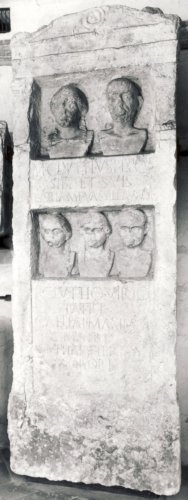La stele a pseudoedicola, leggermente rastremata verso l'alto, poggia su una base grossolanamente sbozzata alta cm. 44 ca., al di sopra della quale la stele è inquadrata da due pilastri angolari lisci sormontati da capitelli di ordine dorico. I capitelli sorreggono un architrave sormontato da un fregio liscio e da un frontone molto schiacciato con cornice rilevata sui lati. Il frontone è internamente decorato da una patera ombelicata mentre non sono più distinguibili i caratteri plastici degli acroteri a seguito del degrado del supporto. Ambo i lati presentano un foro quadrangolare circa a metà dell'altezza, probabilmente finalizzato all'inserimento della stele in un più ampio contesto monumentale. Nello spazio tra i due pilastri si aprono due nicchie rettangolari prive di modanatura, ciascuna sovrastante uno specchio epigrafico non corniciato, con superficie liscia e leggermente ribassata. Nella nicchia superiore sono contenuti due ritratti a busto nudo, privi delle spalle e rastremati verso il basso da una linea arcuata: si tratta dei due coniugi defunti menzionati nell'iscrizione sottostante, la moglie posta a sinistra, il marito a destra. Nella nicchia inferiore trovano posto tre busti, anch'essi rastremati verso il basso da una linea arcuata, due femminili a sinistra e al centro, uno maschile a destra. I ritratti femminili che occupano i due registri sono contrassegnati dalle medesime caratteristiche: presentano acconciatura con scriminatura centrale e capelli che scendono verso le orecchie un po' ondulati terminando sulle spalle in due boccoli, ciascuno ad un lato del collo. I busti maschili si caratterizzano, invece, per cranio maggiormente allungato che lascia in vista una fronte ampia e scoperta, capigliatura poco folta con ciocche piatte pettinate in avanti e grandi orecchie a vela. Il busto maschile nella nicchia inferiore sembra, però, maggiormente accurato nelle proporzioni. I ritratti femminili si avvalgono di acconciature che consistono in trasposizioni provinciali di modelli urbani che richiamano in parte il tipo di Agrippina Maggiore (14 d.C.-33 d.C.) e in parte quello di Antonia Minore (36 a.C.-37d.C); i ritratti maschili, invece, con capigliatura caratterizzata da ciocche portate in avanti, richiamano una moda in uso nell'età di Claudio (41-54 d.C.). In entrambi i casi le acconciature adottate costituiscono validi indizi per la datazione della stele. A seguito del pessimo stato in cui si conservano i busti è difficile definire se i ritratti presentassero tratti fisionomici evidenti. A questo riguardo restano ber visibili solo gli occhi, contornati da palpebre a cordoncino. Al di sotto delle nicchie contenenti i busti i campi epigrafici non corniciati ospitano le formule onomastiche dei defunti. Il testo iscritto presenta ductus regolare con parole tra loro separate mediante segni d'interpunzione triangoliformi con vertice verso l'alto; il modulo delle lettere è leggermente allungato e sono visibili leggere apicature. Le formule onomastiche femminili presentano la desinenza arcaica in -ai.