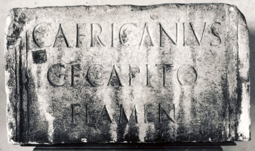 - ISCRIZIONI fronte - C(aius) Africanius / C(ai) f(ilius) Capito / flamen / ------? - Lettere posate maiuscole - Incisione - latino
