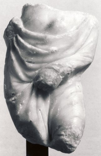 E' rappresentata la porzione centrale di un corpo virile panneggiato; il mantello avvolge pesantemete il corpo, ma lascia scoperto il torso; la mano sinistra raccoglie e sostiene il mantello sotto il ventre.