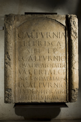 - ISCRIZIONI fronte - Calpurnia / L(uci) f(ilia) Prisca / sibi et / L(ucio) Calpurnio / Quadrato patri, / Valeriae C(ai) f(ilia) / Secundae matri, / L(ucio) Calpurnio / Pudenti fratri/ IIIIII vir(o) aug(ustali). - Lettere posate maiuscole - Incisione - latino