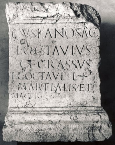 - ISCRIZIONI fronte - Cuslano sac(rum). / L(ucius) Octavius / C(ai) f(ilius) Crassus) / L(ucius) C(aius) Octavi L(uci) f(ilii) / Martialis et / Macer. - Lettere posate maiuscole - Incisione - latino