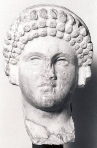 Testa con capelli raccolti in una pettinatura composta da tre file ciocche arrotolate su se stesse, e cinte da un diadema quasi non visibile frontalmente. Posteriormente piatta.