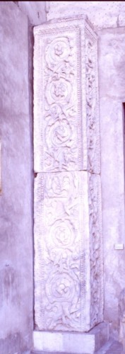 Pilastro a base quadrata, la cui decorazione è racchiusa da un'elegante cornice, composta da una fila di perline, da un kymation e infine da una fascetta decorata a "cane corrente". Il motivo decorativo all'interno delle specchiature è composto da una serie di girali d'acanto, ornati da fiori variegati. A circa metà dell'altezza risulta diviso in due parti, non si sa se per il reimpiego o se dall'origine.