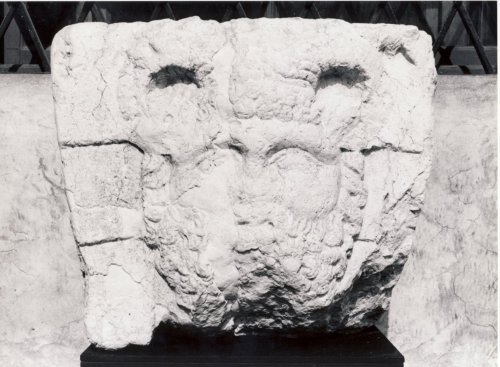 Chiave di volta di arco tetrapilo, a pianta rettangolare, con piloni composti da piedistalli, piedritti lisci e colonne tortili. Vi si trova la raffigurazione di una testa, circondata da una barba a fitti riccioli, e sulla testa, spuntanti dai capelli ricciuti, due ampie corna ricurve. Il rilievo antropomorfo è di ispirazione ellenistica.