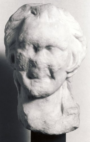 Testa di donna matura, i capelli sono a ciocche distinte volte all'indietro e raccolte sul capo in un nodo, ai lati del collo scendono due lunghi boccoli, gli occhi sono segnati da occhiaie, la bocca chiusa è resa con angoli profondamente segnati.