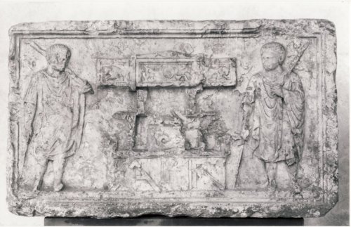 - NOTIZIE STORICO CRITICHE La lastra faceva parte di un monumento funerario dedicato ad un uomo, il cui lavoro è rappresentato dagli attrezzi raffigurati sul rilievo, probabilmente capomastro o imprenditore edile. Fu trovato presso la chiesa di S. Fermo a Verona, nelle cui vicinanze era situata una necropoli, sorta intorno al I secolo d.C. e utilizzata fino a circa il VII secolo d.C. La collocazione di questa lastra presso la chiesa fu illustrata da un disegno di Saraina nel XVI secolo. La presenza del littore sui rilievi funerari e la raffigurazione della sella curulis possono in alcuni casi sottolineare il ruolo sociale che il defunto aveva ricoperto in vita. I littori avevano il compito di accompagnare e proteggere i magistrati romani. Questo tipo di rilievo si diffonde già dalla prima età imperiale soprattutto nelle regiones X e XI e si ritrova spesso in monumenti funerari dedicati non solo a quattuorviri o duoviri, ma anche a seviri. Quindi si può ipotizzare che il defunto avesse in vita ricoperto una carica magistratuale.