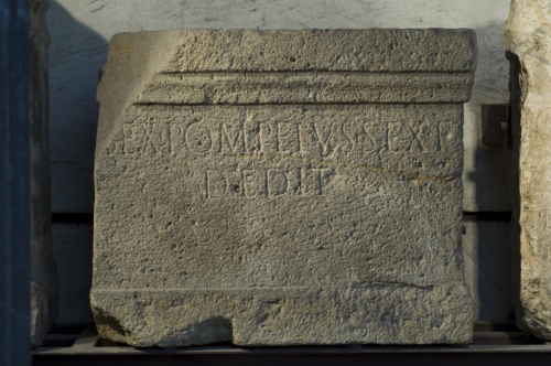 - ISCRIZIONI fronte - Sex(tius) Pompeius Sex(ti) f(ili) / dedit. - Lettere posate maiuscole - Incisione - latino