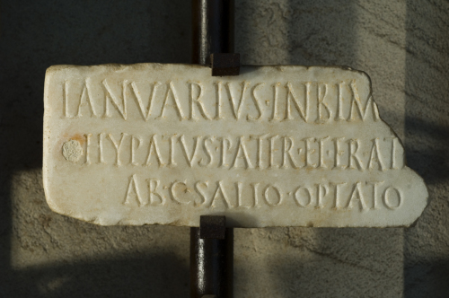 - ISCRIZIONI fronte - Ianuarius in bim[atu obiit, Ianuaria in an(no) IIX obiit]. / Hypatus pater et Erate [mater emerunt ollas IIXXXXX] / ab(!) C(aio) Salio Optato, [C(ai) Sali Erotis liberto]. - lettere posate maiuscole tendenti alla scrittura attuaria - Incisione - latino