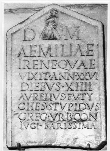 - ISCRIZIONI fronte - D(is) M(anibus) / Aemiliae / Irene, quae 7 vixit ann(is) XXVI, / diebus XIV, / Aurelius Euty/ches, stupidus / greg(is) urb(anae), con/iugi karissima(!). - Lettere posate maiuscole - Incisione - latino