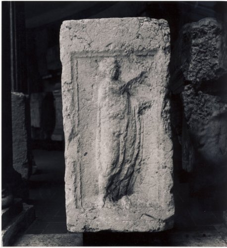 - NOTIZIE STORICO CRITICHE Probabilmente faceva parte di un monumento funerario a recinto, di cui costituiva uno dei limiti angolari. All'inizio dell'Ottocento è stato reimpiegato, come cita Cristofali, "nel canton che fa facciata alla Toprre nella mura della città di dietro la Fiera vicina dove il Fiumicelo sboca fuori della mura sudetta"